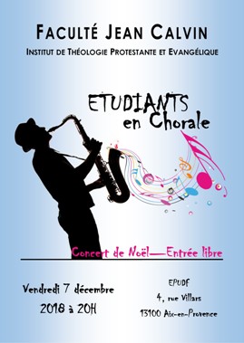 La chorale de la Faculté Jean Calvin organise un concert pour Noël. Pour plus d’informations, voir l’affiche ci-dessous :